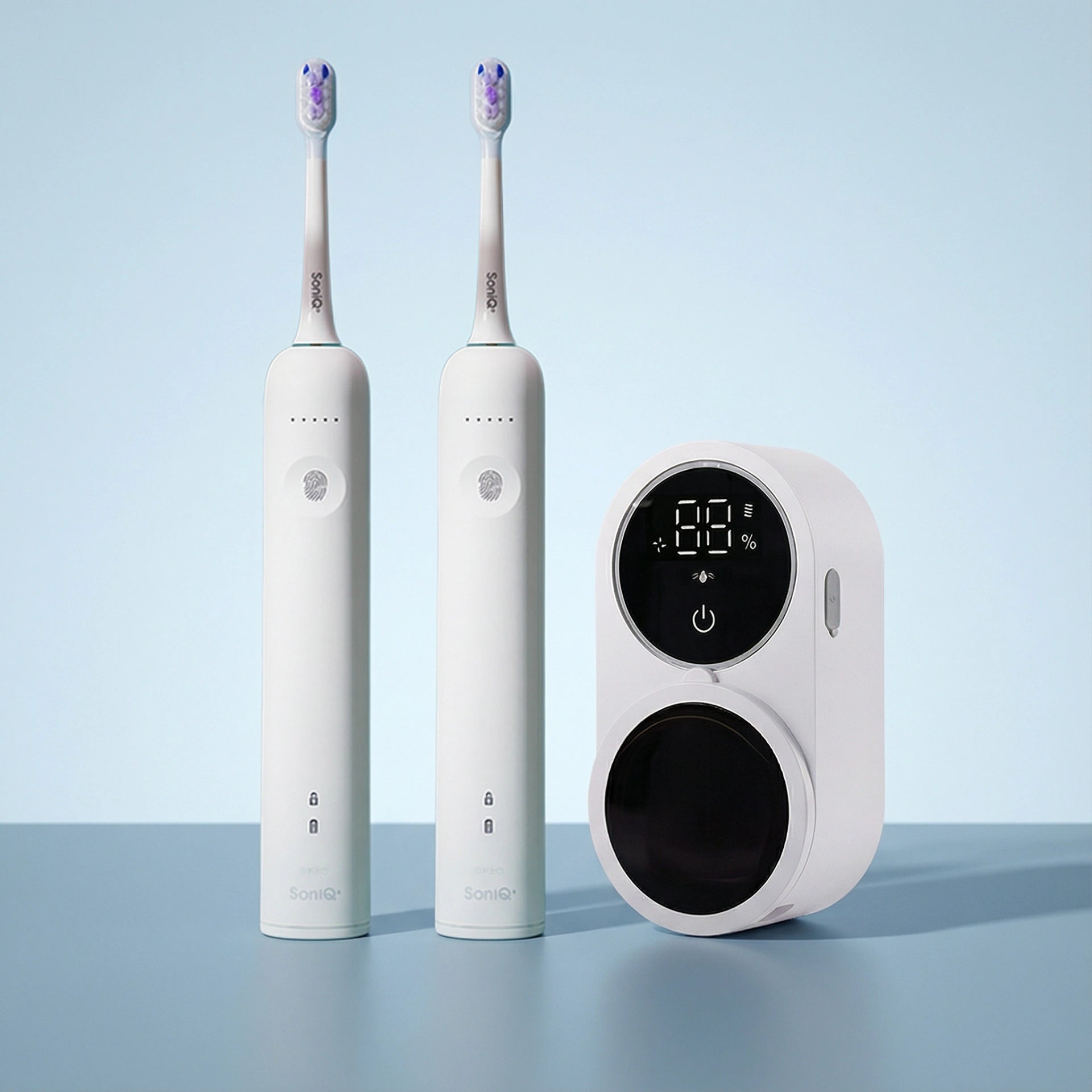 El conjunto incluye dos cepillos sónicos ZENT® SoniQ+ – cada uno con configuraciones y modos de funcionamiento individuales – y un soporte desinfectante ZENT® Uveo Duo, que permite limpiar simultáneamente ambos cepillos con luz UV-C, eliminando hasta el 99,9% de los microorganismos.